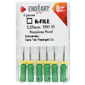 کا فايل دستي اندوآرت ENDOART K FILE، با طراحي پيشرفته Taper، بسيار انعطاف پذير بوده و راندمان بيشتري نسبت به فايل هاي معمولي دارد. مقاومت اين ابزار در برابر خميدگي دو برابر بيشتر از فايل هاي دستي ديگر بوده و استفاده از آن را براي كانال هاي با خميدگي بيشتر مناسب مي سازد. لبه هاي اين ابزار به خوبي پرداخت شده و تيز و آينه مانند است؛ كه اين مسئله كار با آن را بسيار آسان مي كند. علامت گذاري هاي ISO بر روي دسته هاي پلاستيكي فايل هاي K وجود دارد. اين كد گذاري هاي به صورت شماره هاي مشخصي در رنگ هاي كد گذاري شده حك شده اند كه دندانپزشك يا دستيار او را در يافتن آسان ابزار در همه پكيج ها، كمك مي كند.