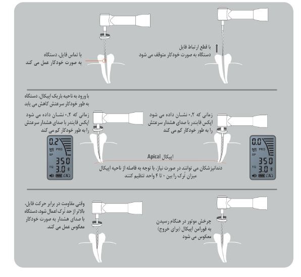 - قابلیت برگشت خودکار Reciproc – Apical Slow Down- Auto Start & Stop- Auto Stop & Revers- Revers