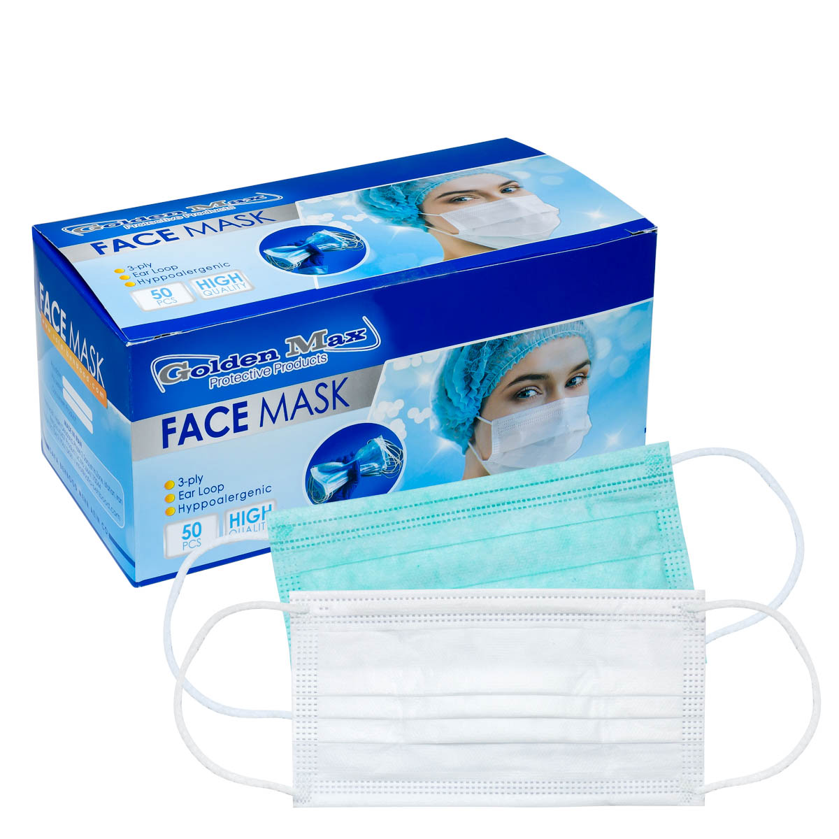ماسک سه لایه برند گلدن مکس در سه رنگ سفید، آبی و سبز و در بسته های 50 عددی عرضه می گردد.