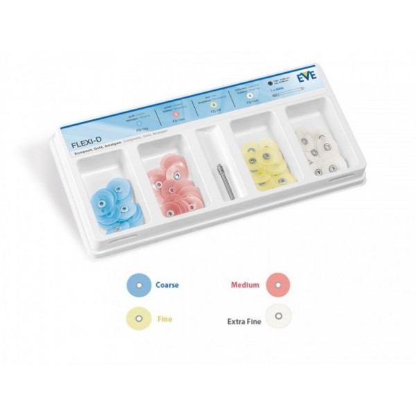 کیت دیسک پرداخت برند EVE در بسته های حاوی 100 عدد دیسک 14 میلی لیتری به صورت 25 عدد دیسک آبی (Coars)، 25 عدد دیسک صورتی (Medium)، 25 عدد دیسک زرد (Fine)، 25 عدد دیسک سفید (Extra-Fine) و یک عدد ماندرل عرضه می گردد.
