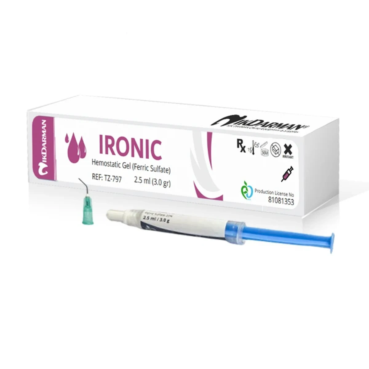 آیرونیک ژل منعقد کننده خون حاوی 20 درصد فریک سولفات در یک بستر ویسکوز بی اثر و محلول در آب است.