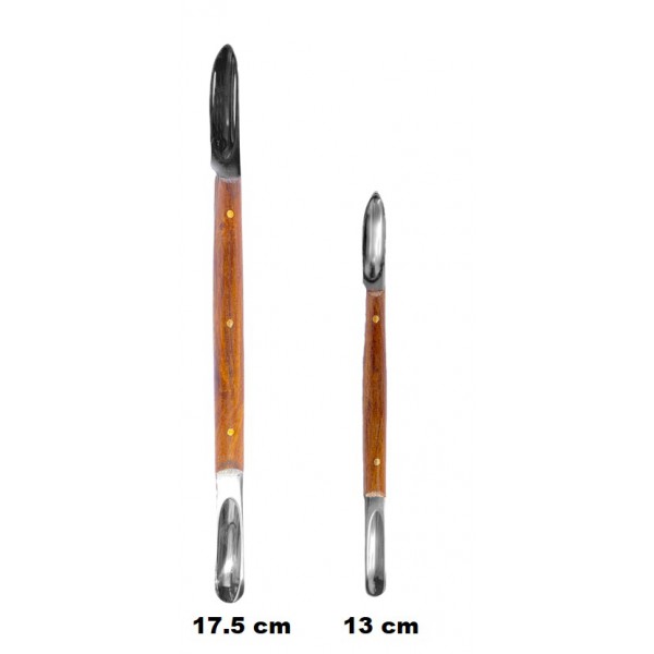 اسپاتول موم ناودانی برند اسمارت اینسترو در دو سایز 13 و 17.5 سانتی‌متری و جنس استیل قابل اتوکلاو با دسته چوبی عرضه می گردد.