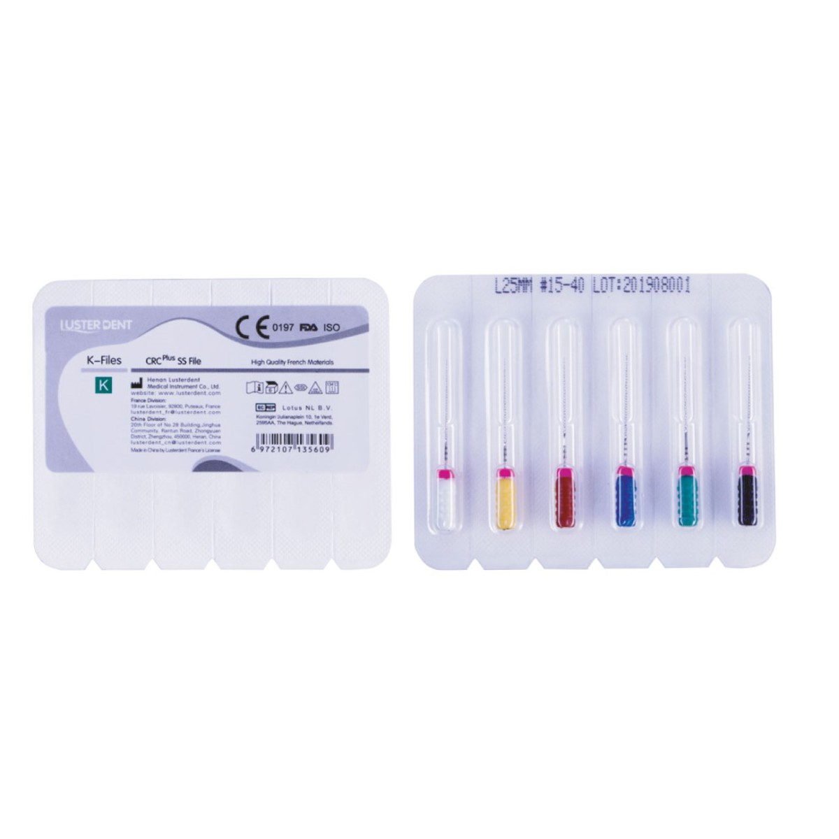 K فایل طول 25 برند لاستردنت با جنس استیل ضد زنگ و سایزبندی 8 , 10 , 15 , 20 , 25 ،  30 , 35 , 40 ,40-15 در بسته‌بندی 6 عددی عرضه می‌گردد.