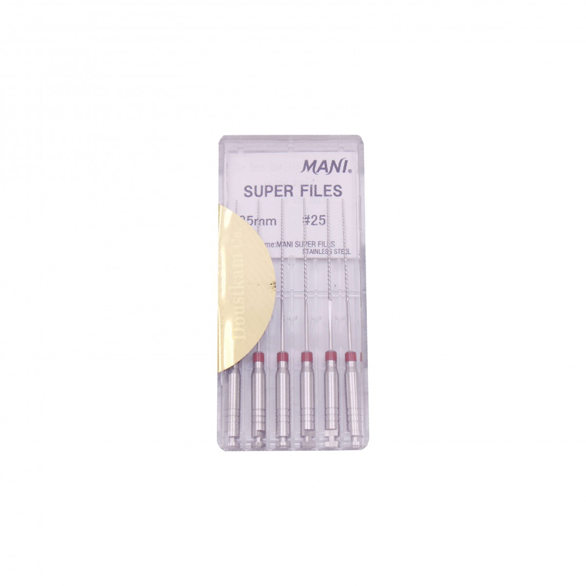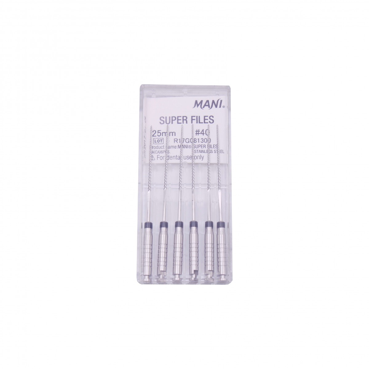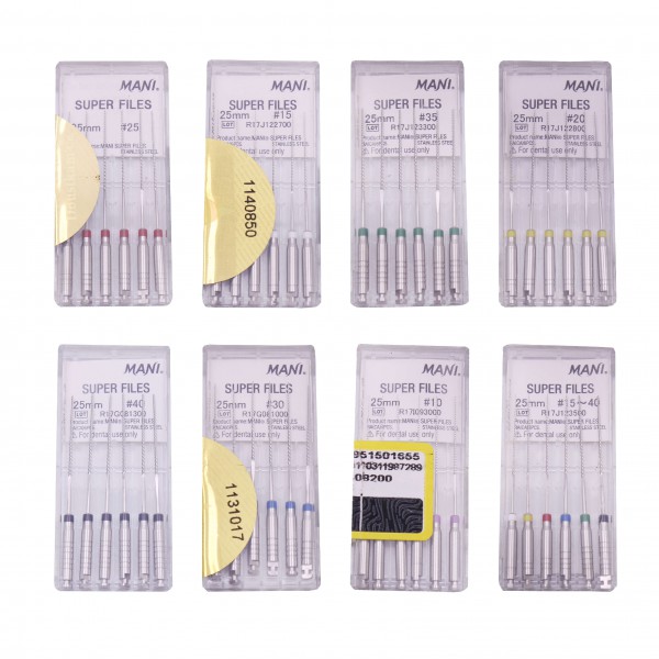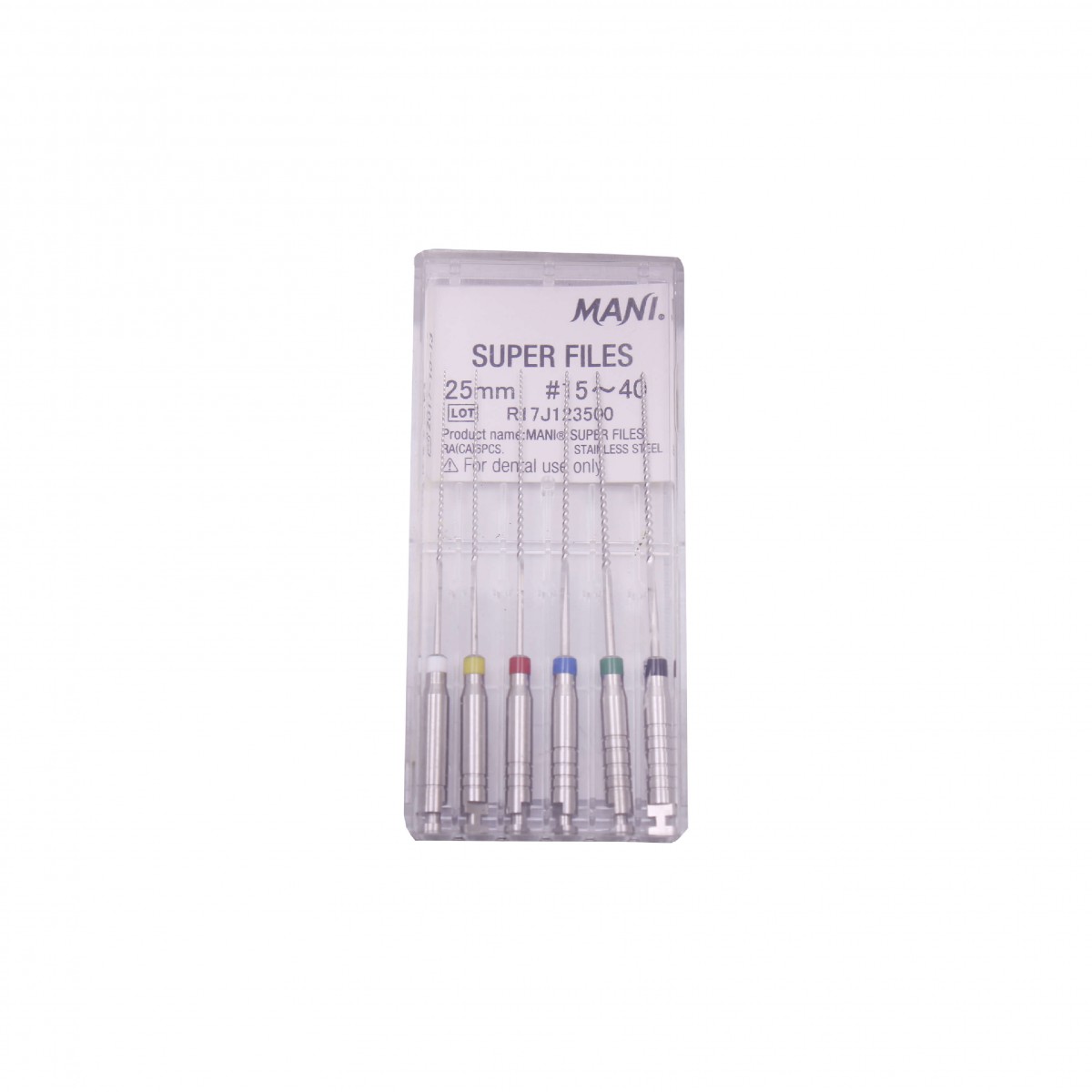 سوپر فایل برند MANI به صورت بسته بندی 6 عددی شامل فایلهایی با تنه و سر آلیاژ استیل ضد زنگ (ترکیب نیکل و کرومیوم)، طول 25 میلی متر و سایزهای 10، 15، 20، 25، 30، 35، 40 و 15-40 عرضه میگردد.
