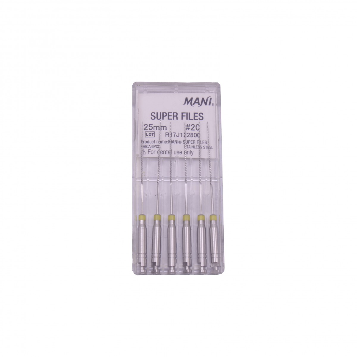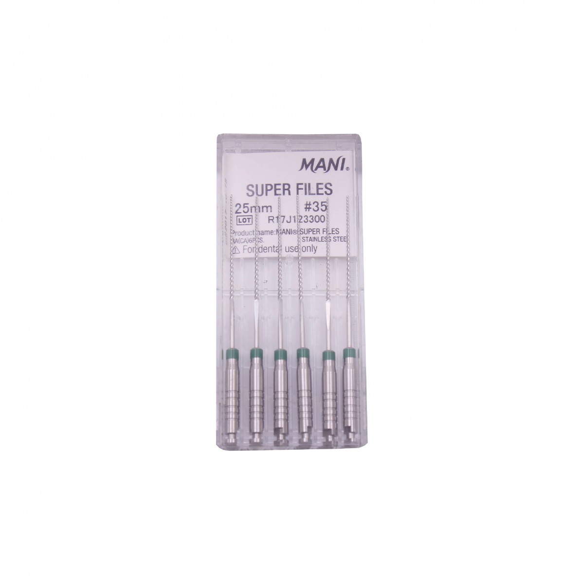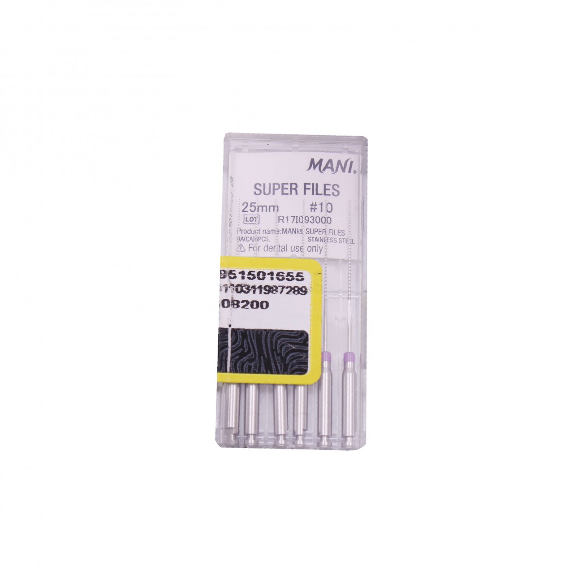 سوپر فایل برند MANI به صورت بسته بندی 6 عددی شامل فایلهایی با تنه و سر آلیاژ استیل ضد زنگ (ترکیب نیکل و کرومیوم)، طول 25 میلی متر و سایزهای 10، 15، 20، 25، 30، 35، 40 و 15-40 عرضه میگردد.