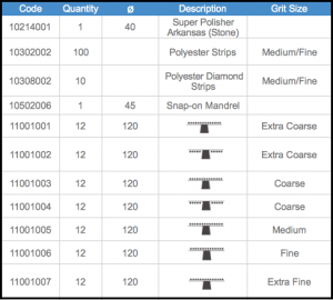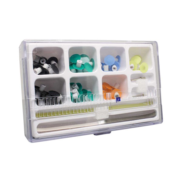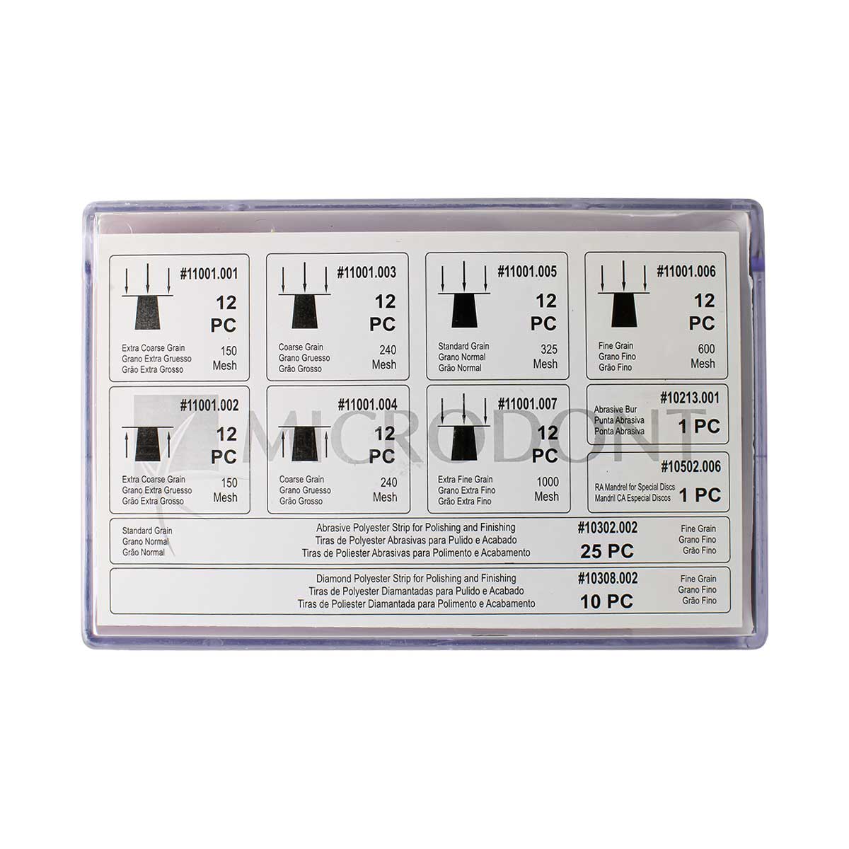 کیت کامل دیسک پرداخت و نوار استریپ برند MicroDont در بسته های حاوی 84 عدد دیسک در پنج رنگ و سختی مختلف با قطر 120 شامل مشکی الماسه زیر و رو(خیلی زبر) هر کدام 12 عدد، سبز الماسه زیر و رو(زبر) هر کدام 12 عدد، آبی الماسه رو ( متوسط) 12 عدد، نارنجی الماسه رو (نرم) 12 عدد، زرد الماسه رو (خیلی نرم) 12 عدد، 100 عدد نوار پرداخت پلی استری، 10 عدد نوار پرداخت الماسه، یک عدد مولت فلیم (شعله ای) شکل سنگ آرکانزاس و یک عدد ماندرل عرضه می گردد.