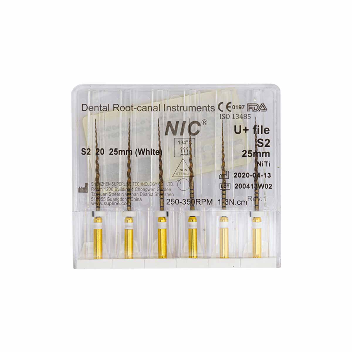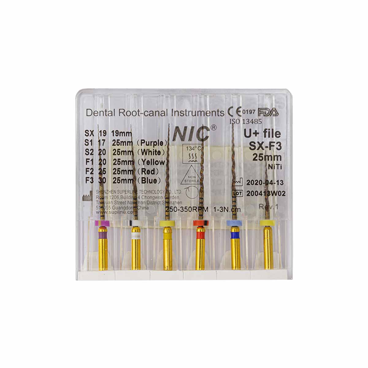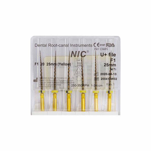 فایل روتاری +U برند NIC با طول 25 میلیمتر دارای سایزبندی F1, F2, F3, SX-F3, S1, S2 SX و در بستهبندی 6 عددی عرضه میگردد.