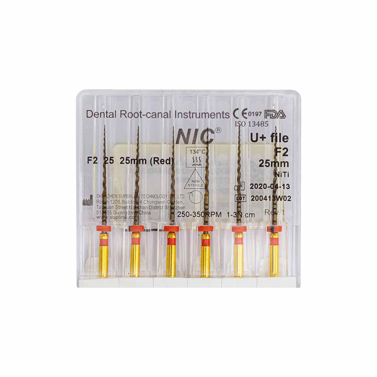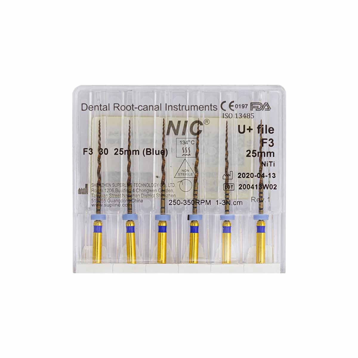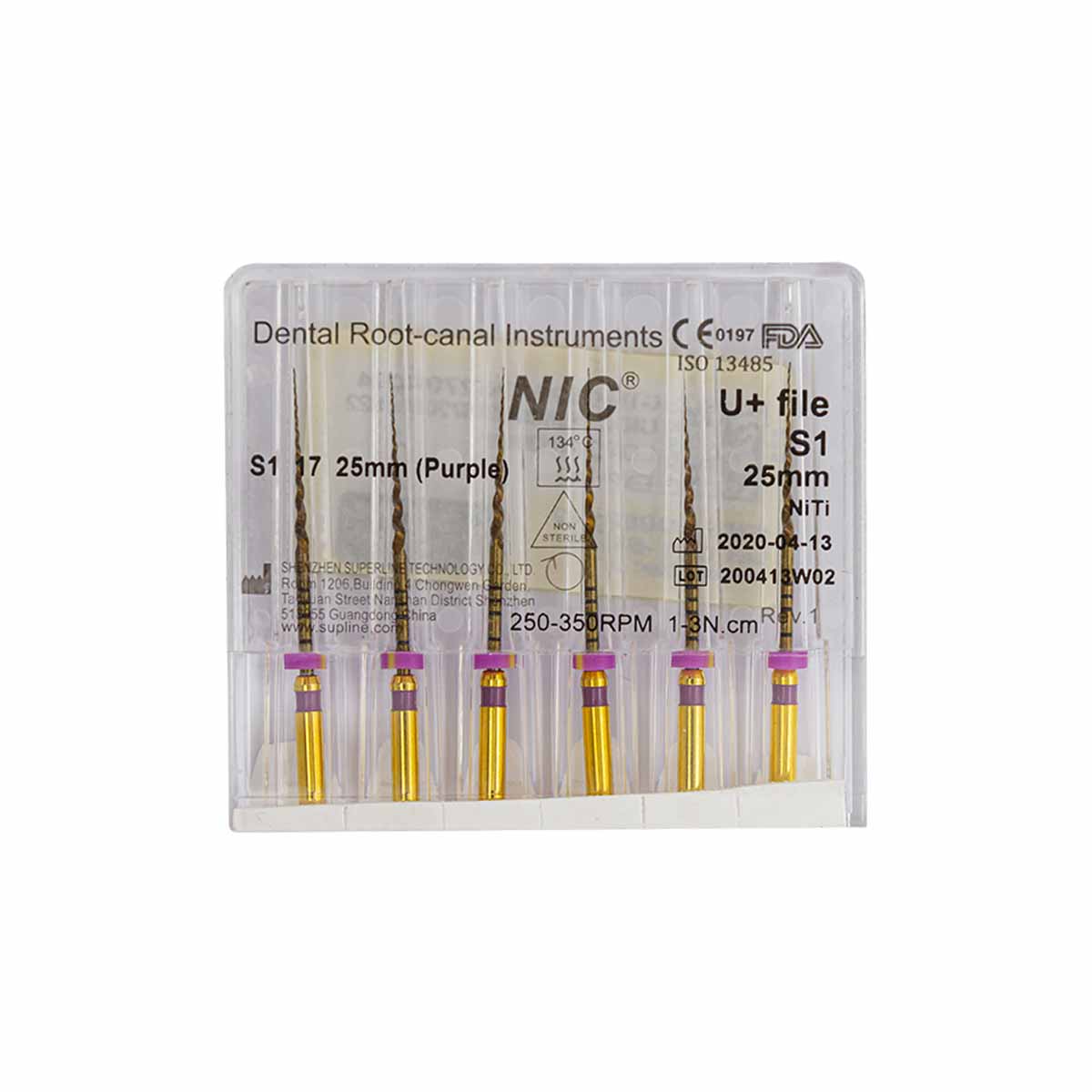 فایل روتاری +U برند NIC با طول 25 میلیمتر دارای سایزبندی F1, F2, F3, SX-F3, S1, S2 SX و در بستهبندی 6 عددی عرضه میگردد.
