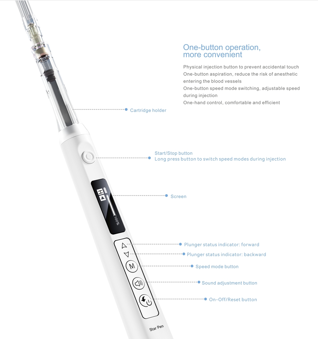 سیستم‌ Star Pen سرنگ بیهوشی الکترونیکی بسیار کارآمدی دارد.دستگاه تزریق داروی بی حسی وودپکر Star Pen برای افزایش راحتی بیمار در طول تزریق برای درمان دندان بسیار پرکاربرد است همچنین از نظر اقتصادی نیز مقرون به صرفه می باشد .